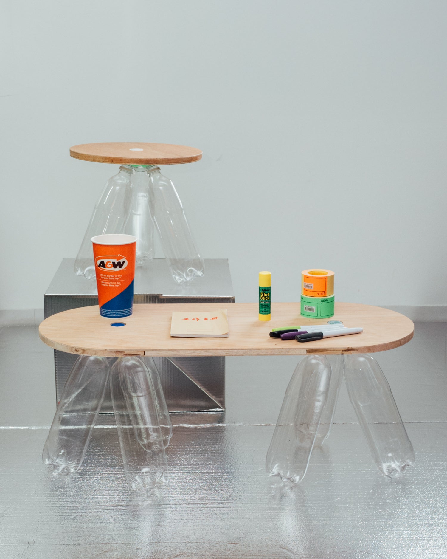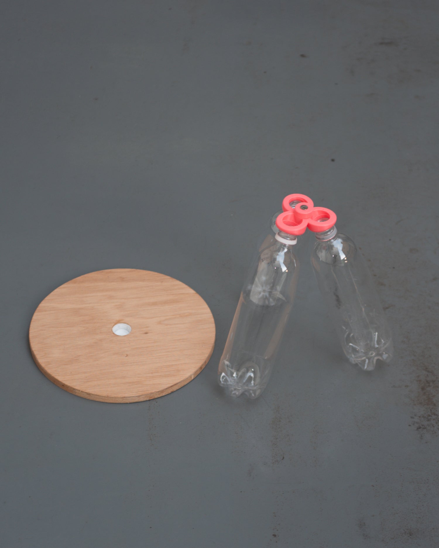 セット内容はテーブル丸板と3Dプリンターで出力したパーツを取り付けた状態でお届けします。ペットボトルはお手元にご用意ください。(在庫がある場合、付属する場合もございます。)